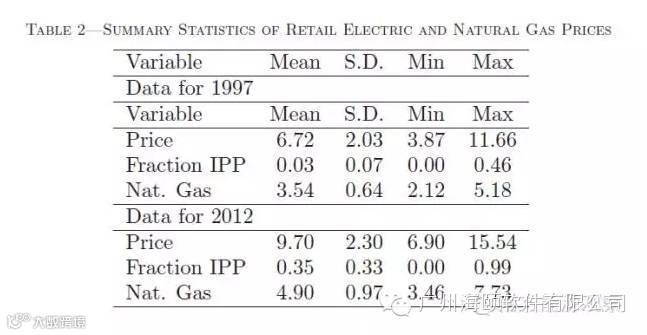 其中ΔElecst = ln(Rates,t) - ln(Rates,t−1)和ΔNGass,t = ln(NG CityGates,t)−ln(NG CityGates,t−1) 分别是所记录的平均电价与城市天然气门站价格的年度变化。我们对此作了从1998年到2012年的数据(从1997年开始发生转变)。表2表示1997年到2012年的变化。总结数据。我们也估计了在州层面的标准误差。