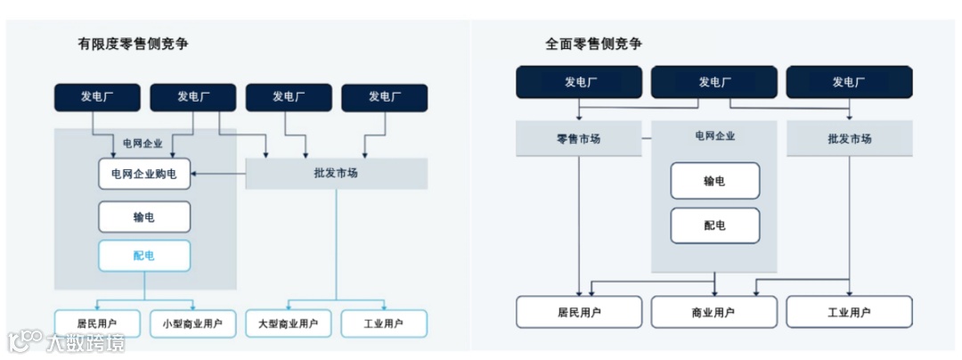 零售侧竞争可分为有限度零售侧竞争(Partial Retail Competition)和全面零售侧竞争(Full Retail Competition)。对特定类别用户(如大型工业企业、商业综合体),有限度零售竞争允许他们参与市场化购电并自主选择售电商,但仍存在受管制电价约束的用户群体(如居民用户),无法自主选择供电商。例如中国的现行机制规定10kV及以上工商业用户全面市场化,居民农业用户执行目录电价。全面零售竞争则意味着发电、批发、零售环节全面竞争,输配电网向所有参与者无歧视开放,工业、商业、合资格居民用户均可自主选择售电商。例如英国自1998年起全面放开零售市场,用户可通过比价网站切换供电商。