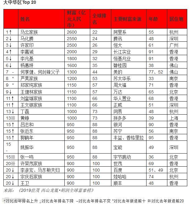 榜单显示,55岁的马云及其家族以2600亿元财富位列大中华区第一,全球排名上升4位到第22位。在《2018胡润全球富豪榜》中,马云及其家族财富2000亿元位列大中华区第四。