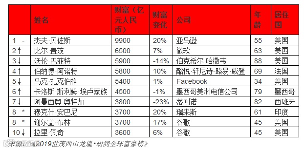 榜单显示,前十名中有6位来自美国,亚马逊CEO杰夫•贝佐斯以9900亿人民币蝉联世界首富。
