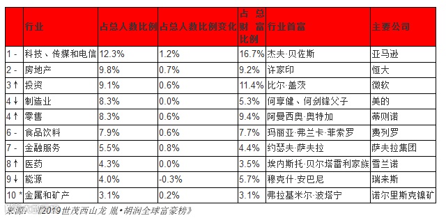 科技行业今年新增的十亿美金富豪数量最多,是全球十亿美金富豪的主要财富来源。加上房地产、投资、制造业和零售业,前五大行业的人数占据了榜单的一半。前十大行业的人数占整张榜单的70%以上。