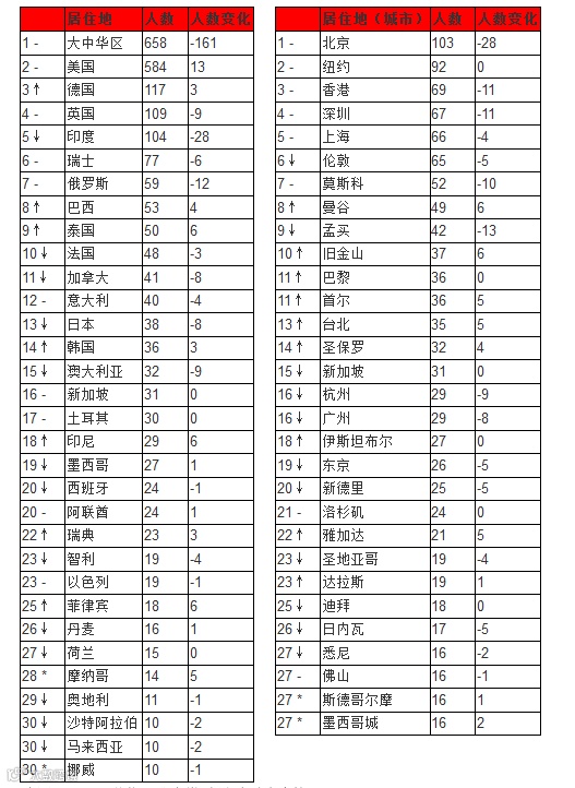 就全球富豪居住地来看,前两名是大中华区和美国,分别有658名和584名十亿美金富豪,占全球十亿美金富豪总数的一半以上。德国和英国超越印度,位列第三和第四。挪威和摩纳哥首次跻身前30名。