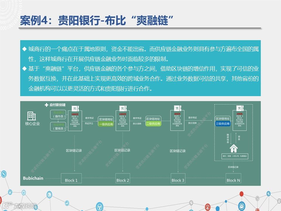 第四个是贵阳银行联合布比发布的爽融链案例。贵阳银行属于城商行,根据属地原则,资金不能出省。而供应链金融业务则具有参与方遍布全国的属性,在这种情况下,城商行在开展供应链金融业务时面临较多限制。基于“爽融链”平台,供应链金融的各个参与方之间,借助区块链的增信作用,实现了可信的业务数据互换,并在此基础上实现更高效的跨域业务合作。通过业务数据可信的共享,其他省份的金融机构可以以更灵活的方式和贵阳银行进行合作。
