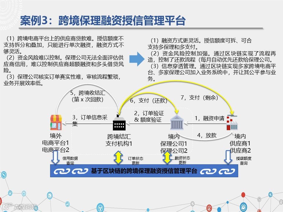 第三,提供可信贸易数据,比如在区块链架构下提供线上化的基础合同、单证、支付等结构严密、完整的记录,提升了信息透明度,实现可穿透式的监管。