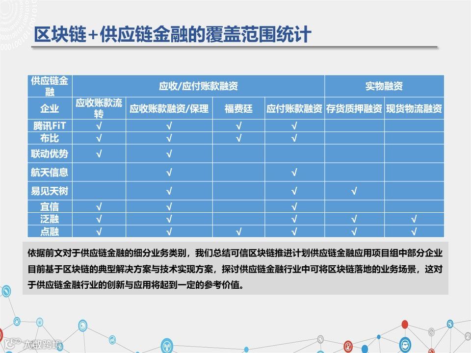 从我们的统计来看,分为应收/应付账款和实物融资。从图中可以看到,腾讯金融科技、布比、联动优势、航天信息、宜信主要覆盖应收/应付账款融资,易见天树、泛融和点融除了应收/应付账款融资,还涉及到实物融资。