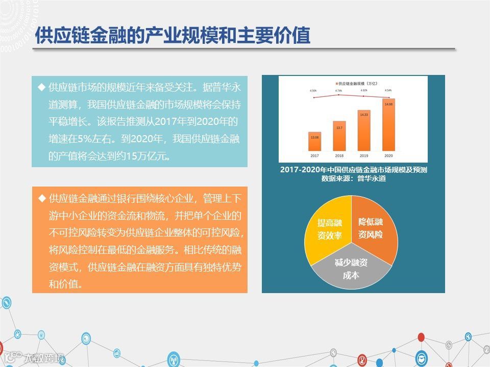 供应链市场的规模近年来备受关注。据普华永道测算,我国供应链金融的市场规模将会保持平稳增长。该报告推测从2017年到2020年的增速在5%左右。到2020年,我国供应链金融的产值将会达到约15万亿元。