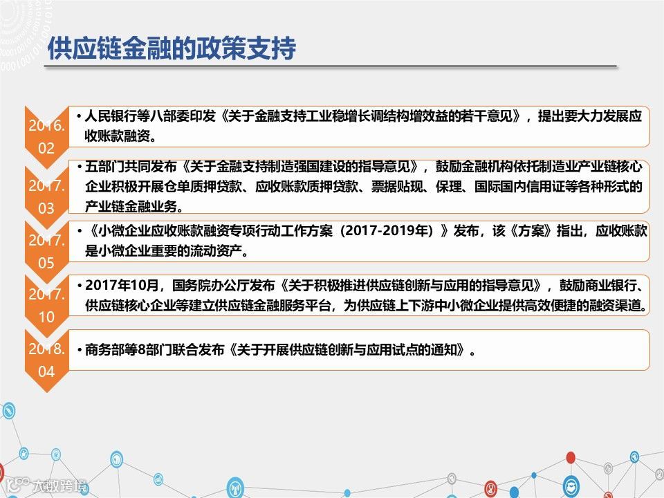 从政策来看,无论从2016年的2月份人民银行联合八部委发布的《关于金融支持工业稳增长调结构增效益的若干意见》提到大力发展应收账款融资等,还是到2018年4月,商务部等八部委联合发布《关于开展供应链创新与应用试点的通知》,都可以看到,政府层面对供应链金融非常重视。