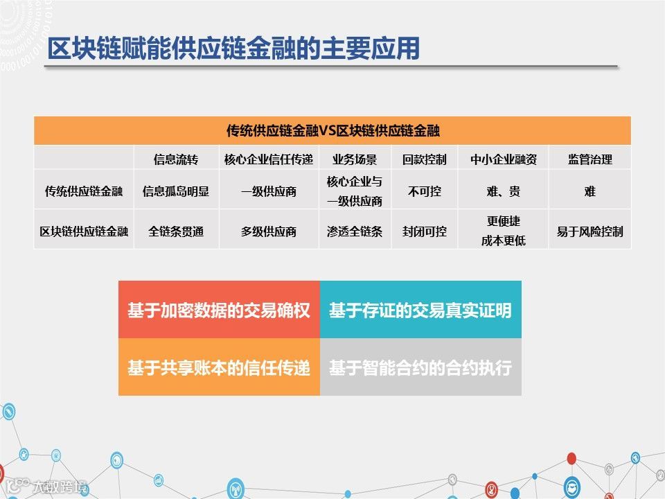 基于区块链的供应链金融,通过区块链技术将各个相关方链入一个大平台,通过高度冗余的确权数据存储,实现数据的横向共享,进而实现核心企业的信任传递,基于物权法、电子合同法和电子签名法的约束,借助核心企业信用额度,提升中小企业的融资效率,降低小微企业的融资成本,加速实现普惠金融。