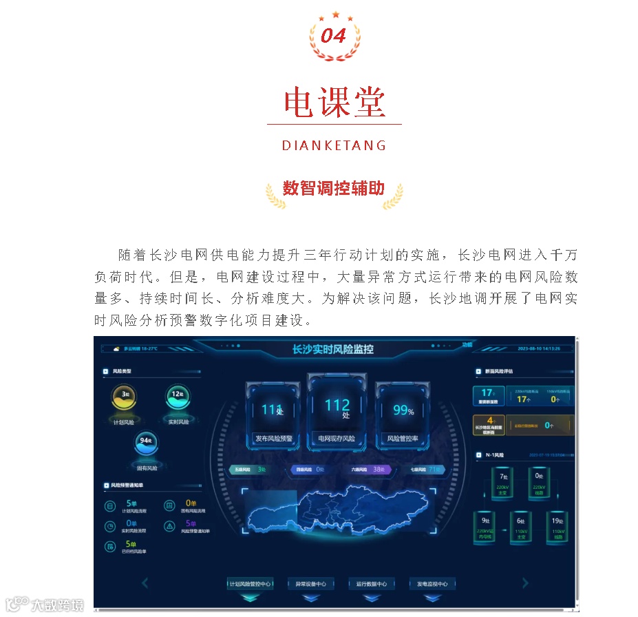 日前,由海颐软件承建的国网湖南省电力有限公司长沙供电分公司主网调度实时风险监控系统成功上线运行,辅助长沙供电公司数字化调控转型建设取得突破性进展。并在2023年(第八期)国网长沙供电公司学习来电电子课堂上发表实用化推广应用经验。