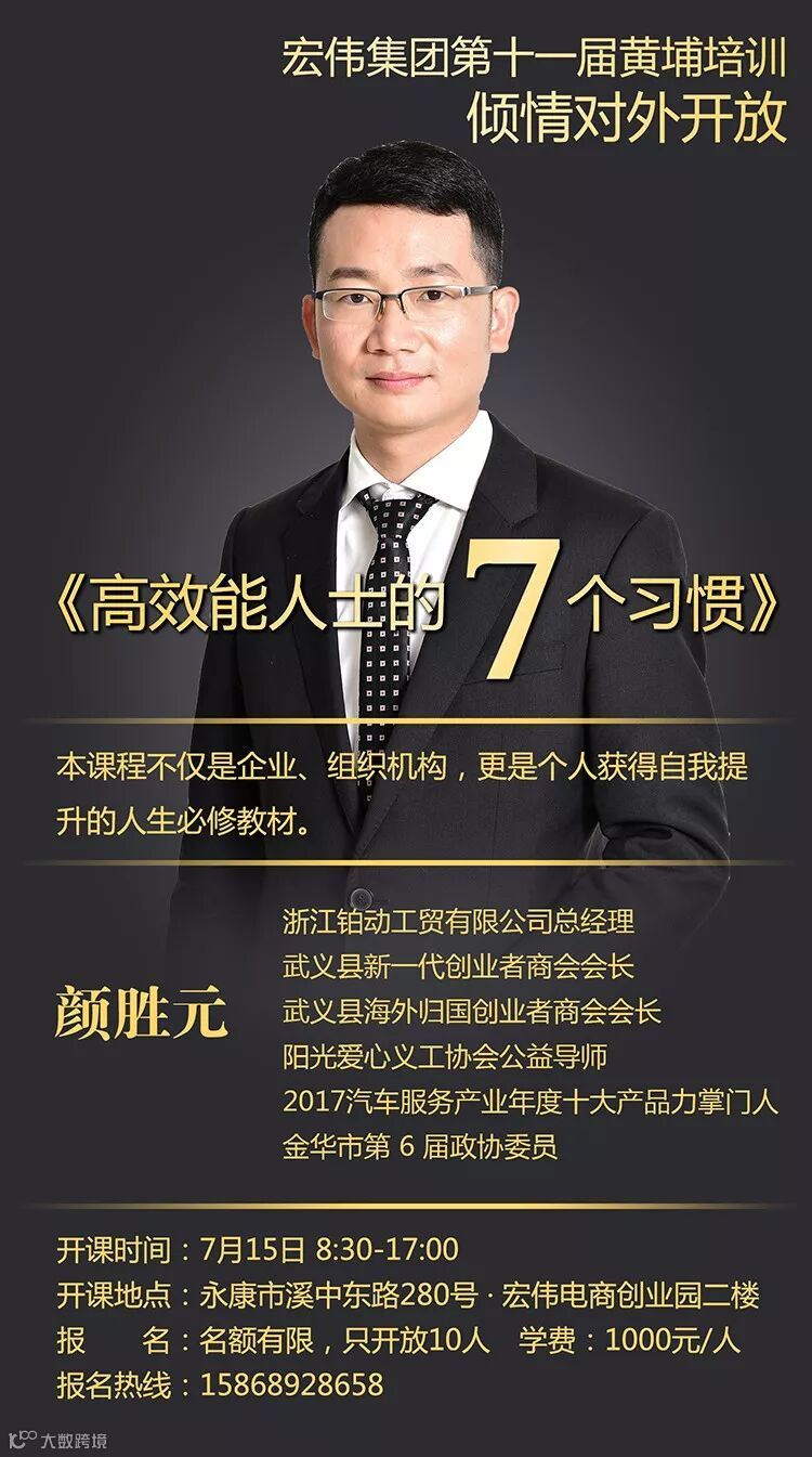 思想决定行动,行动决定习惯,习惯决定品德,品德决定命运。习惯对我们的生活有极大的影响,它是一贯的,在不知不觉中,经年累月影响着我们的品德,暴露出我们的本性,左右着我们的成败。本周日(7月15日),主讲大咖—颜胜元即将隆重登场宏伟第十一届黄埔讲堂,和大家分享"高效能人士的七个习惯" 。七个习惯不仅仅对于高效能人士有价值,也是人生自我修炼的信条,是非常精辟和正确的人生道理。它表达的是一种新的思想水平,强调以原则为中心,以品德为基础,“由内而外”地实现个人效能和人际效能。