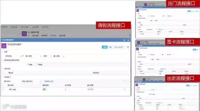 流程优化:OA请假、出差、出门、签卡流程、配置数据写入接口,流程审批后自动推送相关数据到考勤数据库中。