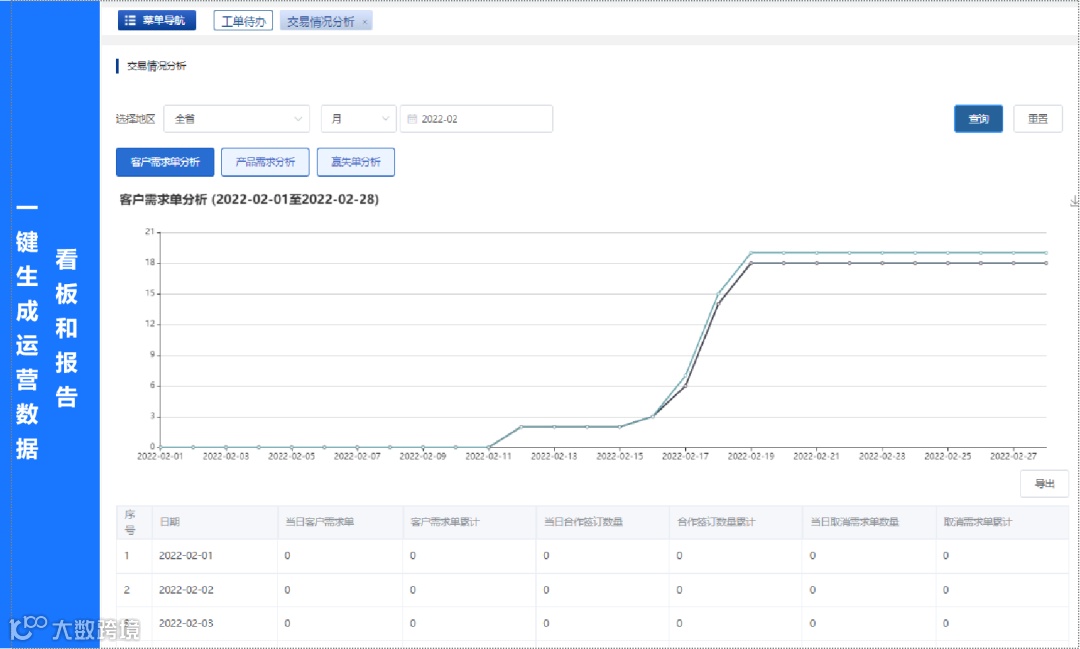 在支撑管理后台为业务管理人员提供增值服务整体推广数据看板,如:产品数量、服务商数量、服务客户量、服务订单量、服务金额、取消订单量、客户满意度等,支持按时间、按单位等维度分析。支持一键生成日报、周报、月报等分析报告,提高运营分析效率。