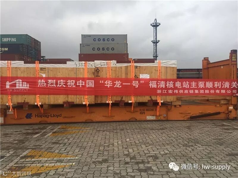 2017年10月12日06:30,福清5、6首台主泵到达宁波大榭招商码头,浙江宏伟供应链集团股份有限公司仅使用9小时(扣除关税缴纳时间)成功完成进口清关工作,并于2017年10月14日11:10完成拆箱装车,安全驶往哈尔滨电气动力装备有限公司,创造了高效不落地报关的典型案例,大大提高了本项目的物流时效及质量,为福清5.6核电机组及中国核电事业作出了贡献。