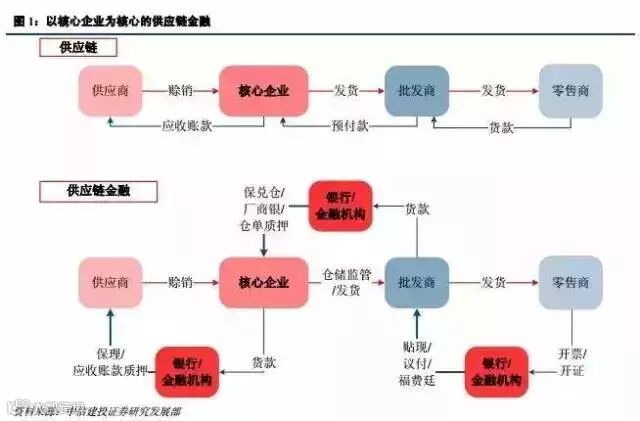供应链金融是对供应链的某个环节或全链条提供定制化的金融服务,通过整合信息、资金、物流等资源,达到提高资金使用效率、为各方创造价值和降低风险的作用。这种服务是穿插在交易过程中的,其主要模式是以核心企业的上下游为服务对象,以真实的交易为前提,在采购、生产、销售的各个环节提供的金融服务。