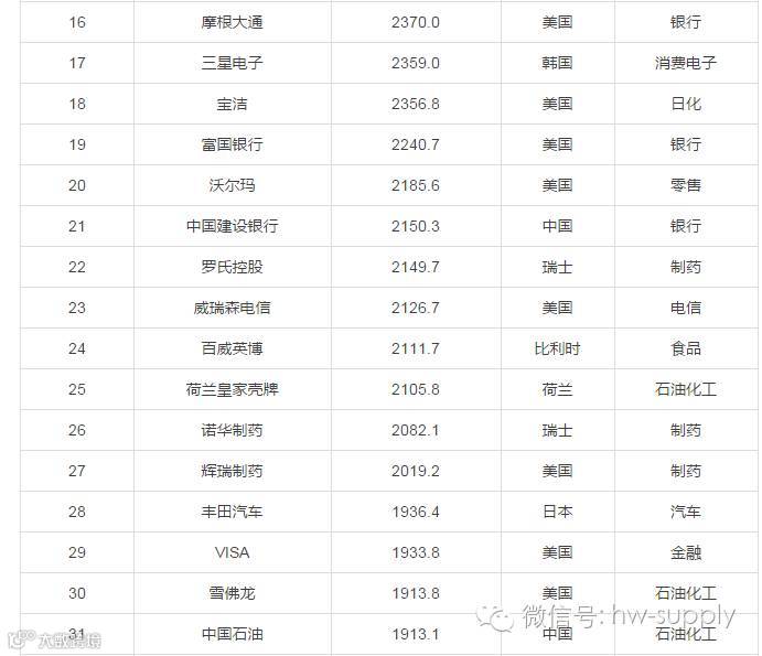 上榜中国企业有阿里巴巴、腾讯控股、中国移动、中国工商银行、中国建设银行、中国石油、中国农业银行、中国银行、中国平安、中国人寿与中国石化。除了腾讯控股与阿里巴巴两家互联网企业,其他入选的大多是中字头的中央国资委直属企业。台积电是唯一入选的台湾企业。