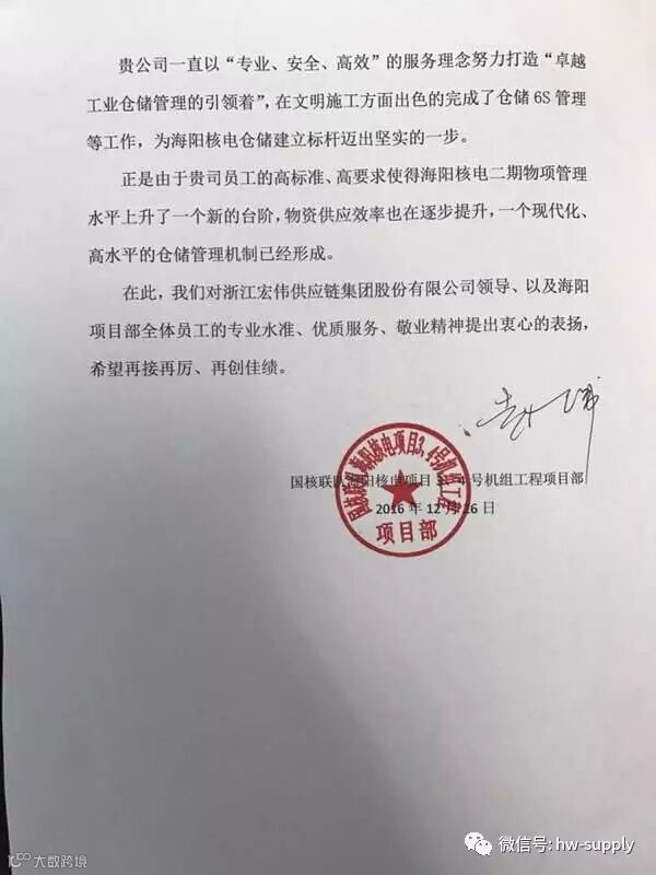金鸡报晓,好运当头,正当这辞旧迎新的美好时刻,宏伟供应链集团子公司和能物流荣幸的收到了来自国家电投国核联队海阳核电项目3、4号机组工程项目部的表扬信,为欢度佳节填上了浓墨重彩的一笔。