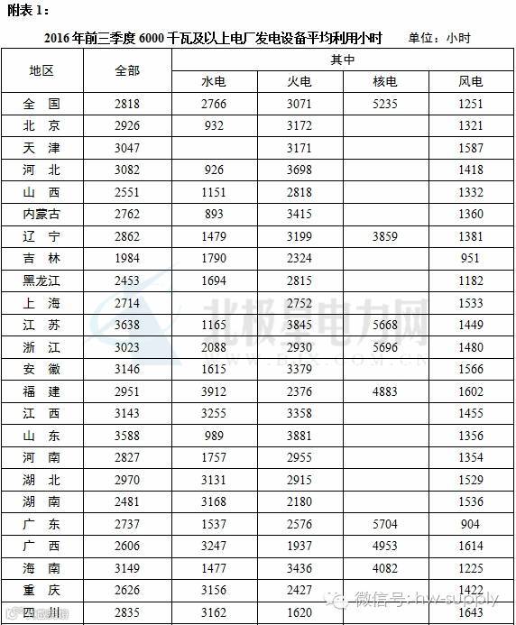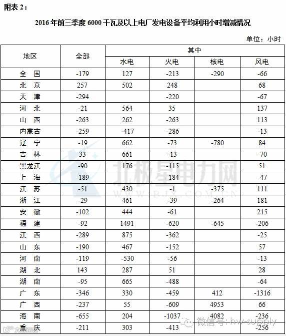 2016年前三季度全国6000千瓦及以上电厂发电设备平均利用小时及同比增减情况分别见附表1和附表2。