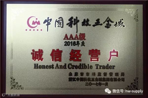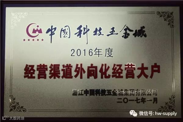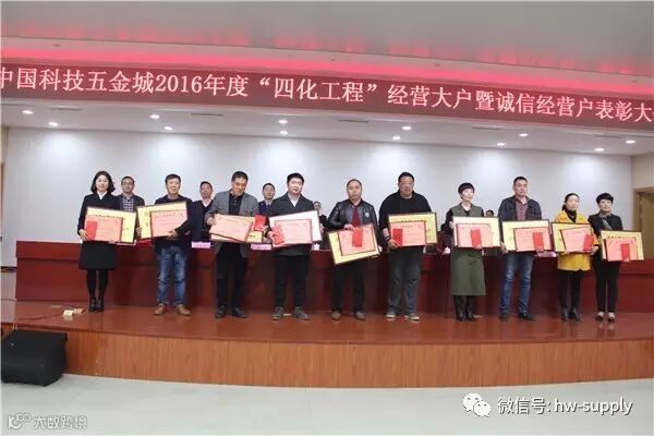 宏伟供应链集团子公司浙江和能现代物流有限公司荣获中国科技五金城“2016年度‘四化工程’经营渠道外向化经营大户”,及“2016年度AAA级诚信经营户”荣誉称号。宏伟供应副总经理李晓庆参与本次大会并领取奖项。