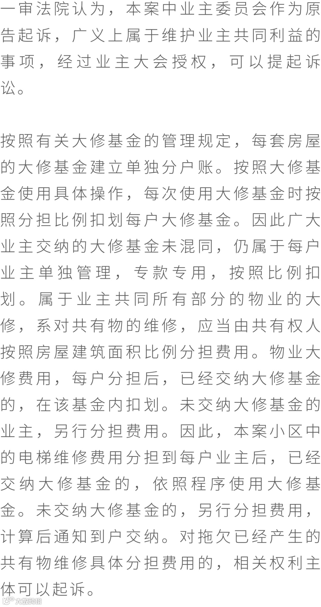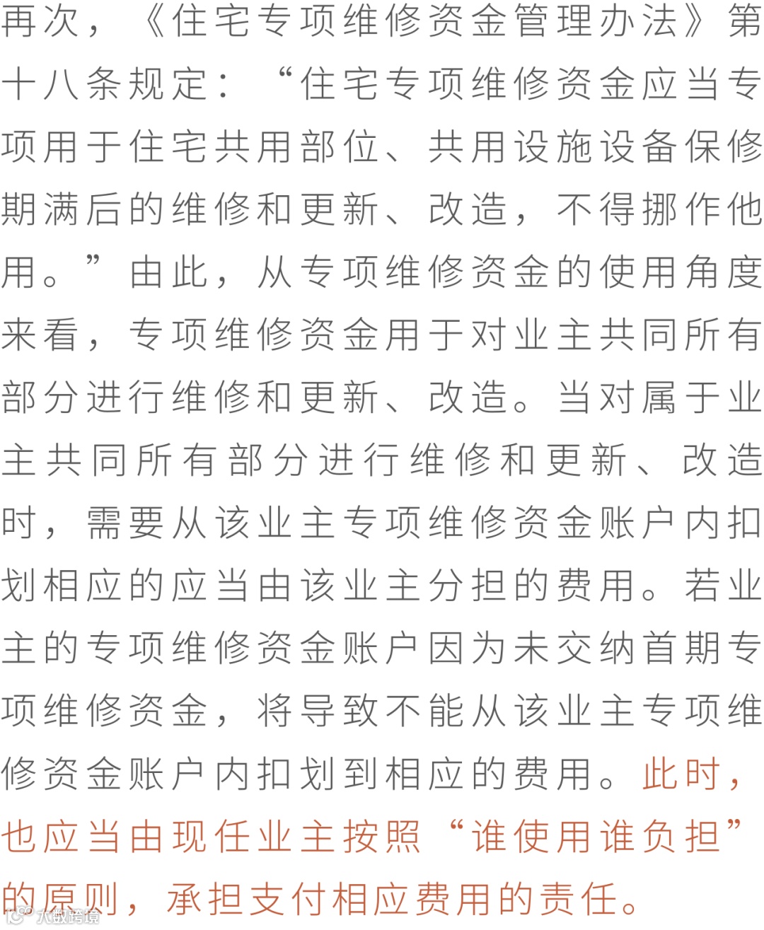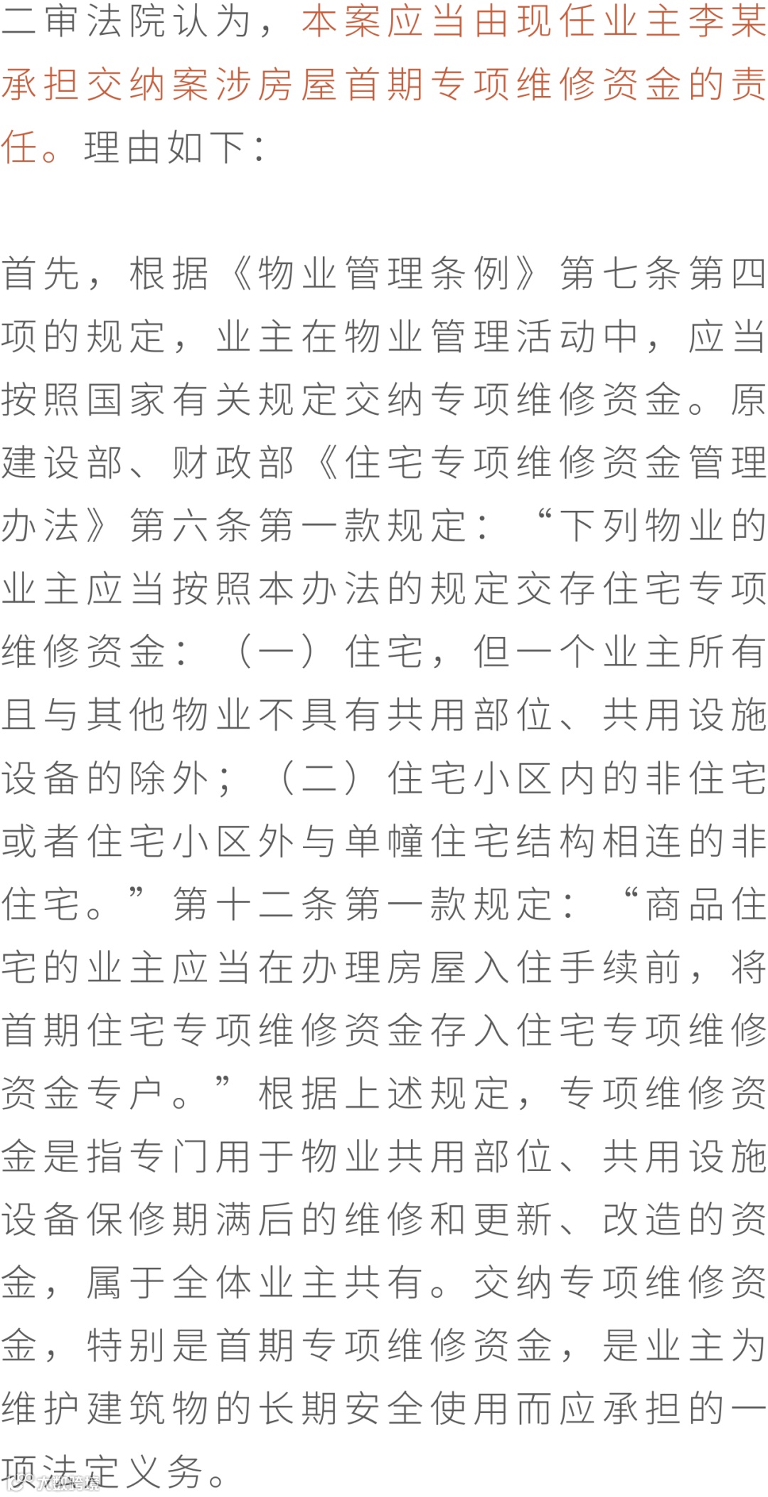 首先,本案二审法院再次明确了交存维修资金是每一位业主为维护建筑物的长期安全使用而应承担的一项法定义务。二审法院的此项认定,再次体现了维修资金“权利与义务”一体性表现,并且再次提醒广大业主不要只关注维修资金的权利属性,更要关注并履行好维修资金的义务属性。