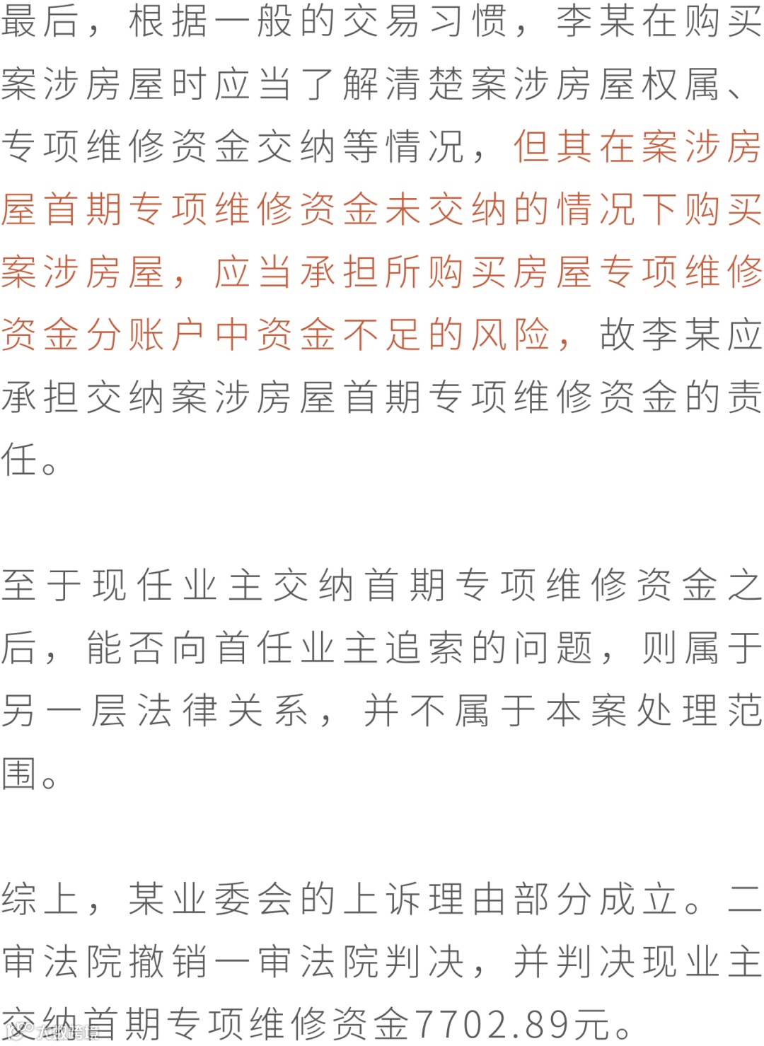 同时,本案也提醒了购房者,在购买普通二手房时一定要注意维修资金的交存事宜并对维修资金的承担作出明确约定,从而最大限度地降低自身购房风险,避免后续纠纷的发生。