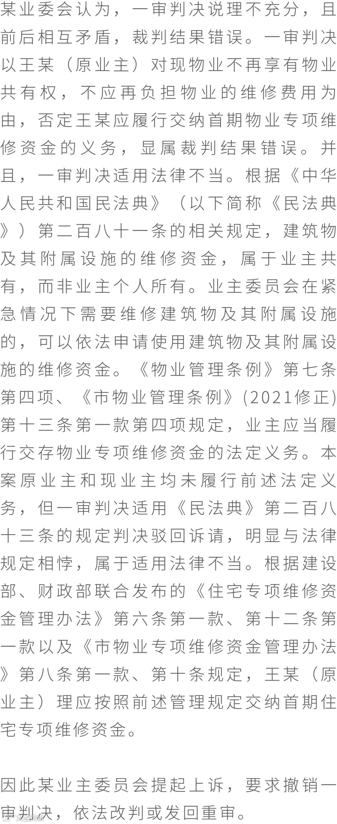 就首期维修资金归集义务到底是原业主承担还是现业主承担的问题,本号曾在《法拍房的维修资金应当由谁交》一文中分析过类似案件。虽然两案案情类似,但法院对该问题的认定却有一定的区别。首先,本案一审法院认为“要求现业主承担首期维修资金交存义务法律依据不足”,故对诉讼请求予以驳回,而法拍房案件中的一审法院则直接认为“首期维修资金交存义务应当由原业主负担”。其次,相比法拍房二审法院意见,本案二审法院的说理更加详细、前后逻辑性强,值得具体分析。