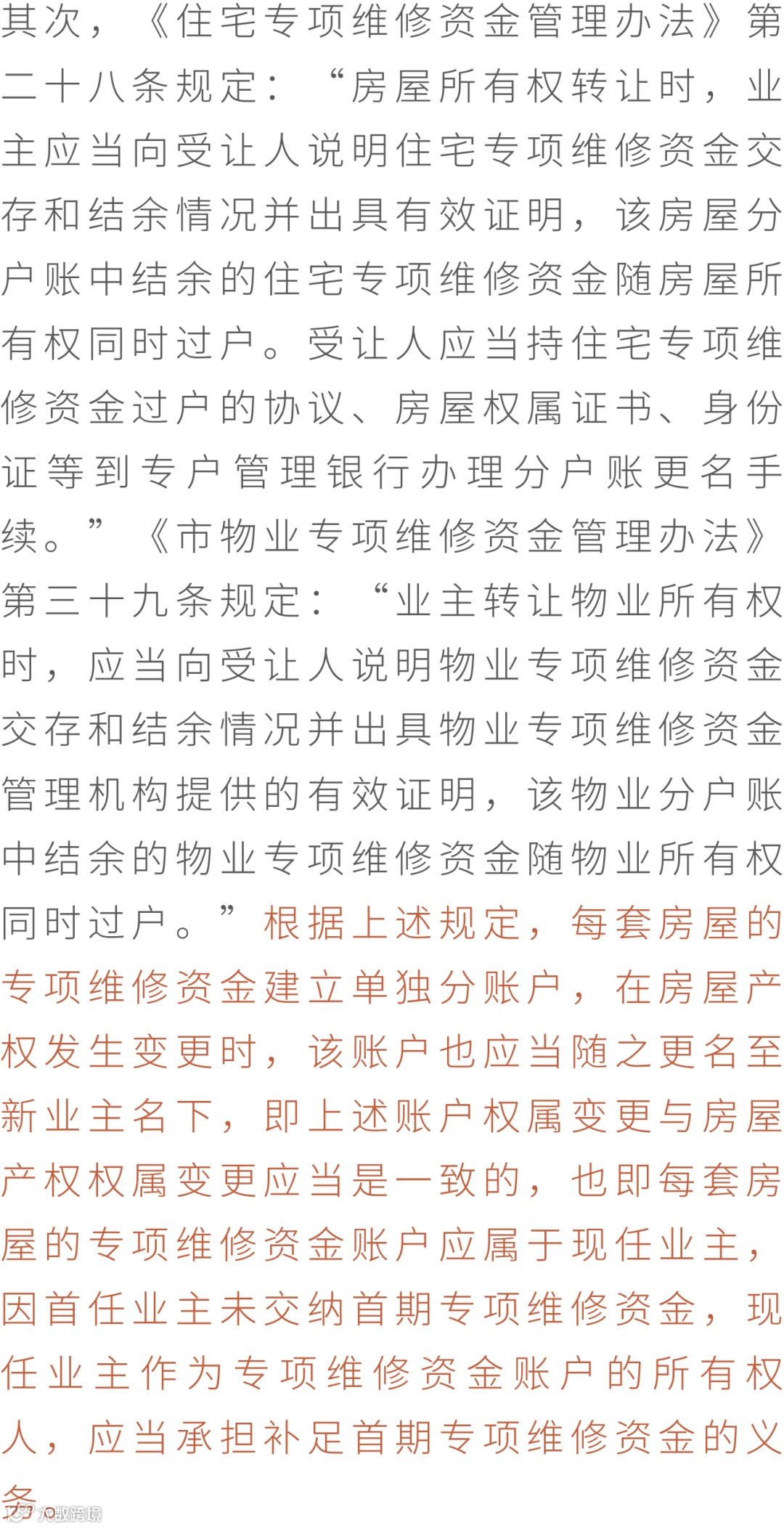 其次,本案二审法院明确了维修资金的账户权属与房屋产权权属的一致性。法院认为,每套房屋的维修资金建立单独分账户,在房屋产权发生变更时,该账户也应当随之更名至新业主名下,即上述账户权属变更与房屋产权权属变更应当是一致的。法院的此项认定明确了“钱随房走”的合法性,并且也构成了首期维修资金应由现任业主交存的基本理由。
