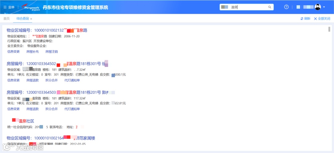 针对上述情况,丹东市维修资金管理系统上线综合查询功能,工作人员可在系统首页的搜索框内键入业务申办人员提供的物业区域、房屋所有人姓名、房屋位置等其中任意一项信息,即可在搜索结果的下方快速选择不同业务类型点击办理,实现一次搜索,集合呈现,切实帮助工作人员简便办事流程,有效降低群众办事等待时长,提高窗口服务质量。