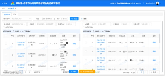 此外,丹东市维修资金管理系统还将业务、银行、财务三方数据有机融合,准确匹配业务数据和银行交易流水,自动生成会计凭证,实现业务、银行、财务的三方对账,有效保证数据的一致性和精准性,使得业务数据能直接为财务数据提供支撑,贯通业务、银行、财务全链条,达到“业财一体化”的效果。
