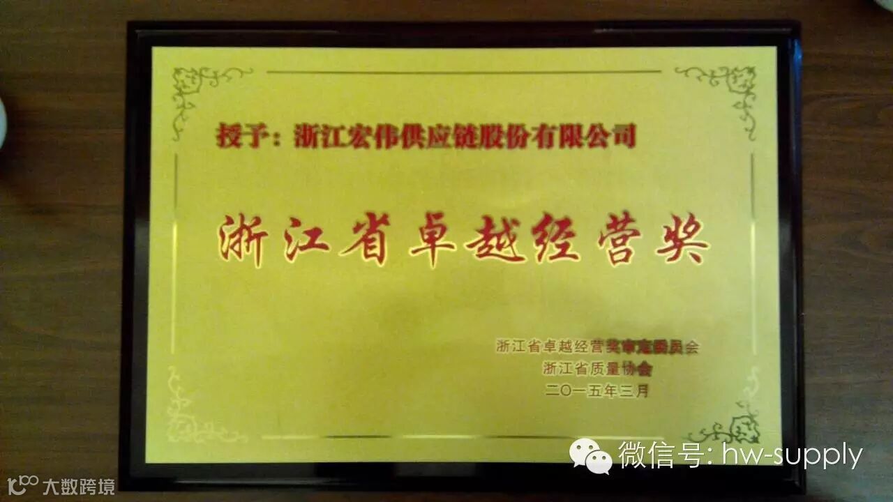 2015年3月27日,浙江省质量协会第九届三次会员代表大会在湖州举行。国家质检总局总工、中国质量协会副会长刘卓慧,浙江省质量技术监督局副局长纪圣林等领导出席了本次大会,浙江宏伟供应链股份有限公司作为获奖企业应邀参加。
