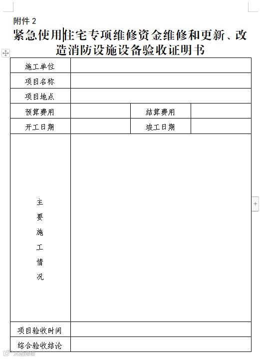 2.紧急使用住宅专项维修资金维修和更新、改造消防设施设备验收证明书