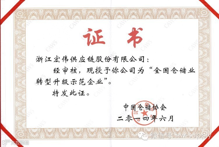 本次大会上颁发了《全国仓储业转型升级示范企业》、《全国仓储设备技术应用优秀推进企业》的奖项,浙江宏伟供应链股份有限公司、北京东方信捷物流有限责任公司、山东盖世国际物流集团有限公司、上海新英源物流有限公司、山东华派克物流有限公司、正本物流有限公司、安得物流股份有限公司、威海国际物流园发展有限公司共8家企业获得全国仓储业转型升级示范企业荣誉。为更好的为核电、石化、装备制造业等能源行业提供专业的现场仓储和物流配送服务,宏伟工业供应于2010年成立了全资子公司浙江和能现代物流有限公司,和能专注于为客户提升主营业务价值,同时联合母公司为客户带来快捷的一站式解决方案、物资大包、信息化管理、供应链金融等服务,以客户第一的理念,为您提供安全、质量、高效的服务。
