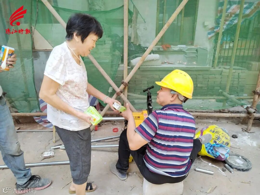 岐阳社区居民在社区微改过程中为工人送清凉。