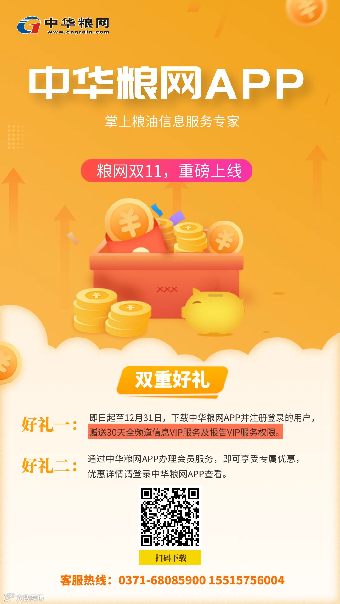 即日起至12月31日,下载中华粮网APP并注册登录的用户,赠送30天全频道信息VIP服务及报告VIP服务权限。