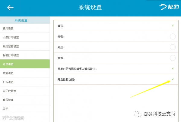 1.开启挂起功能,PC餐饮版前台--系统设置--订单设置--勾选挂起/叫起功能