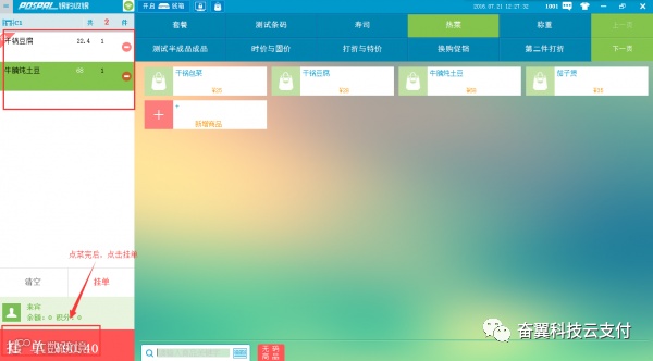 适用于先消费,后结账的门店,可先将客户点的商品挂单到相应桌号,客户消费完后再到前台取单结账