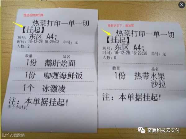 挂起状态下可以追加菜,厨房也会收到通知,厨打小票显示: