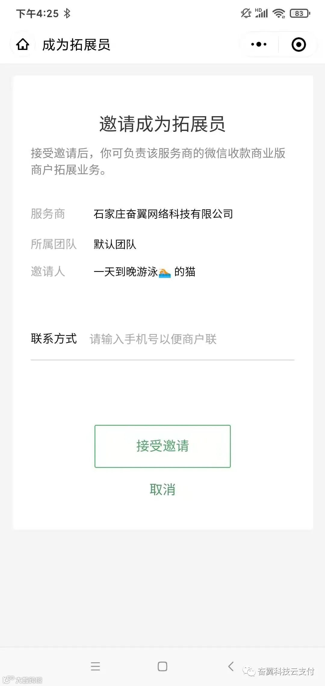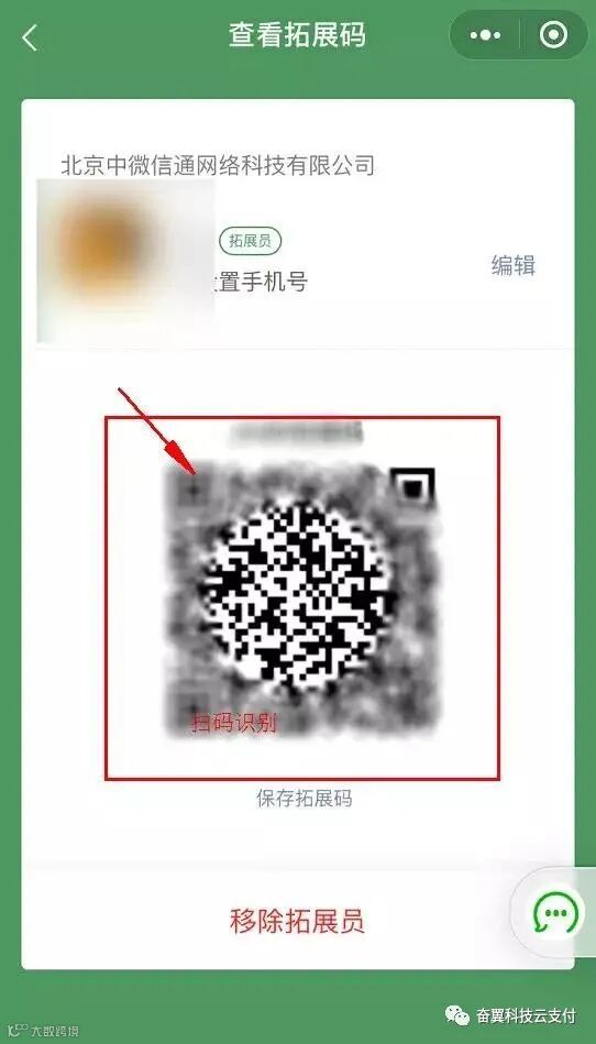 2、点击底部菜单“拓展员”-“拓展员”,出来一个拓展码,长按识别进入,点击“接受邀请”,成为微信买单拓展员!(需要拓展码加v联系:13165580138)