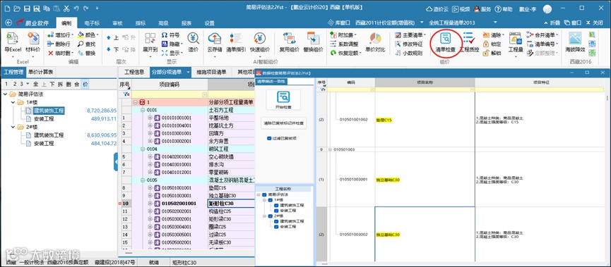 在整个项目造价编制过程中,快速对相同清单项的单价、项目名称、项目特征等进行对比检查,针对单价、特征、名称、单位等内容通过格式刷方式快速修改调整。