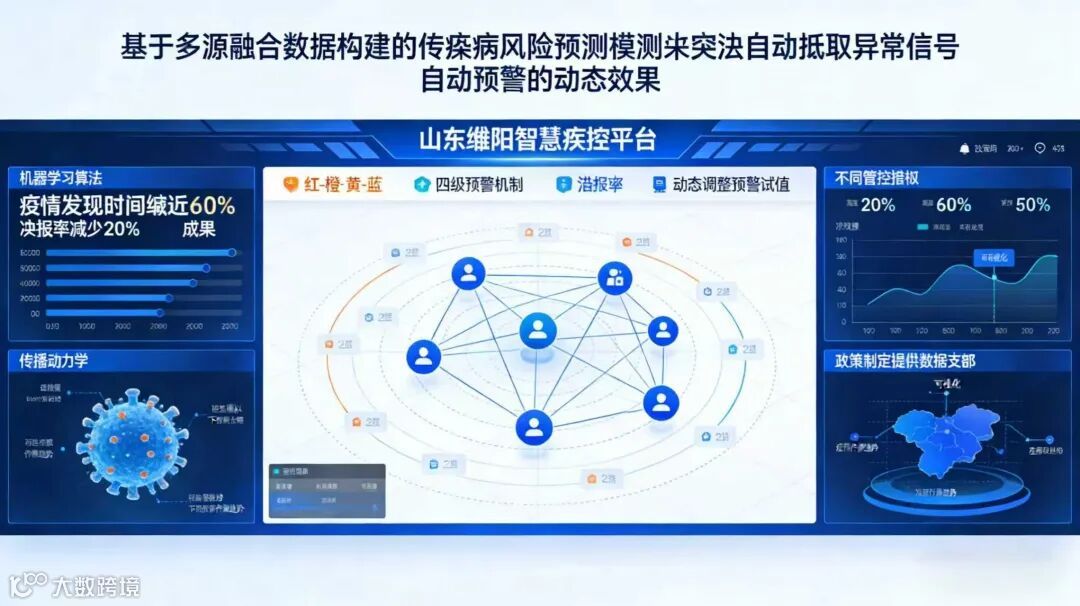 基于多源融合数据,构建传染病风险预测模型,运用机器学习算法实现异常信号的自动捕获、自动预警。通过建立“红-橙-黄-蓝”四级预警机制,动态调整预警阈值,让预警更精准、更及时。在山东潍坊,智慧疾控平台实现疫情发现时间缩短60%,误报率降低60%,有效提升了早期预警能力。此外,通过传播动力学建模,还能模拟不同管控措施下的疫情传播趋势,为政策制定提供数据支撑。