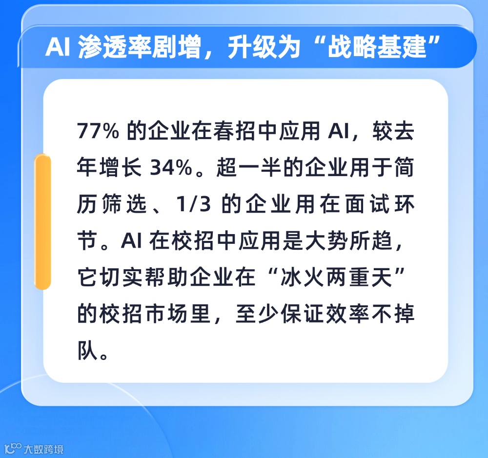 AI 正在悄悄改变校招的玩法——它不再是概念,而是实实在在的效率工具。数据显示,超过 77% 的企业在2025年的春招中启用 AI,简历筛选、面试评估、流程跟进……AI 已经渗透到招聘的每一个环节。