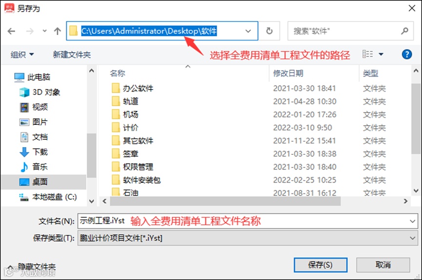 2、在弹出的提示窗口选择“是”,接下来选择全费用综合单价工程文件的存储位置,并填写工程名称,如图示: