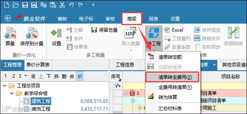 1、在工程结构树任意处点击“高级”—“转工程”—“清单转全费用”功能,如图示: