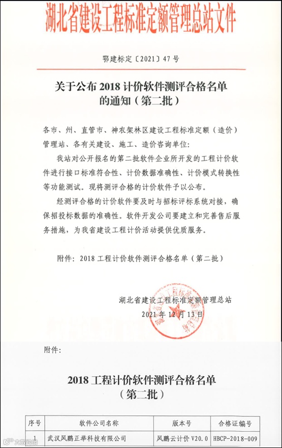 由成都鹏业软件股份有限公司研发,武汉风鹏正举科技有限公司代理的“风鹏云计价V20.0”计价软件于2021年12月10日通过湖北省建设工程标准定额管理总站组织的现场评测会,成为2018计价软件测评合格名单(第二批)的计价软件。