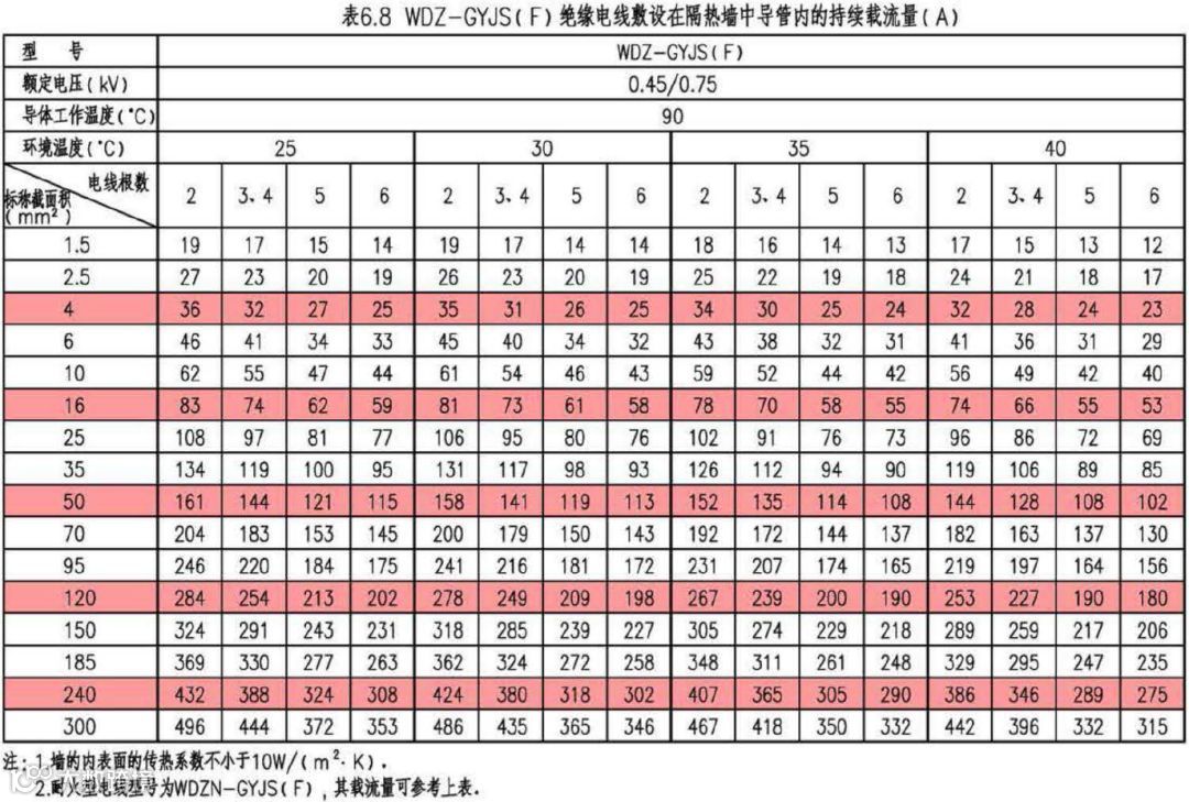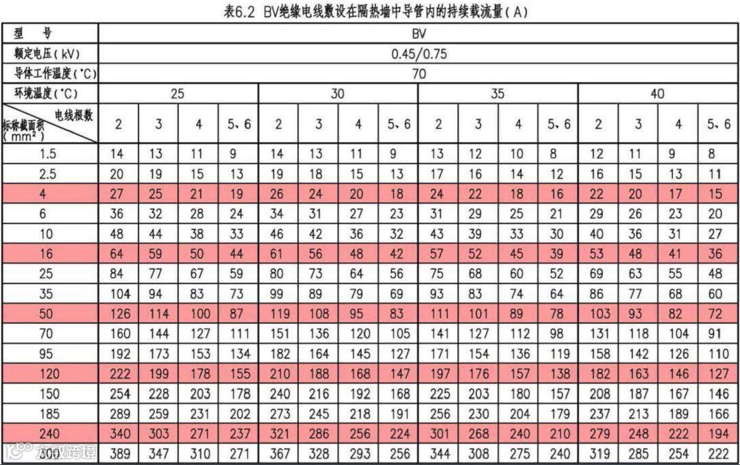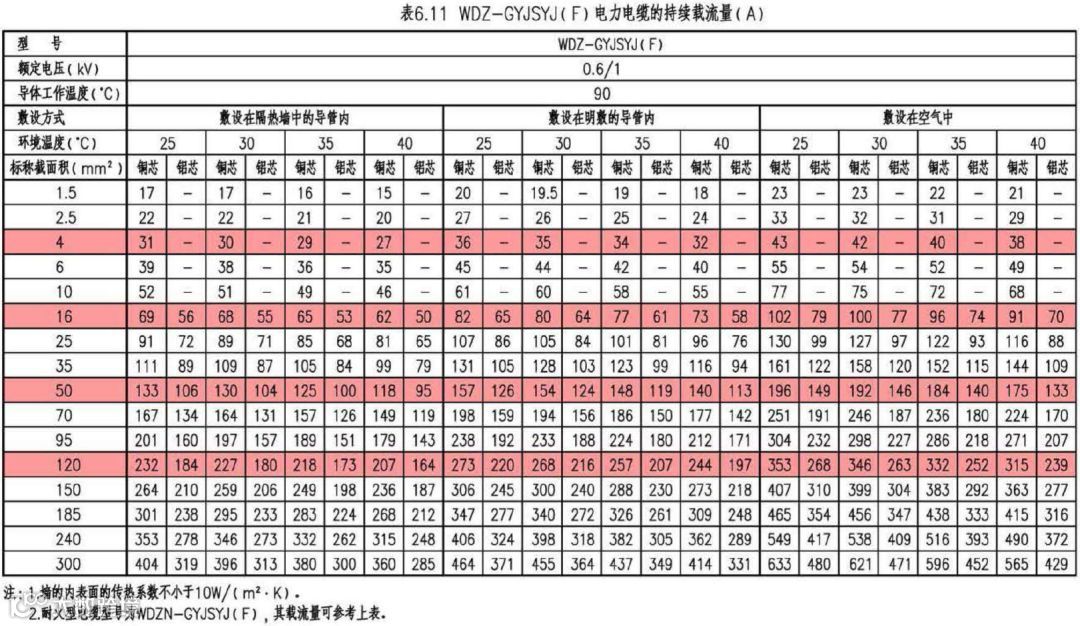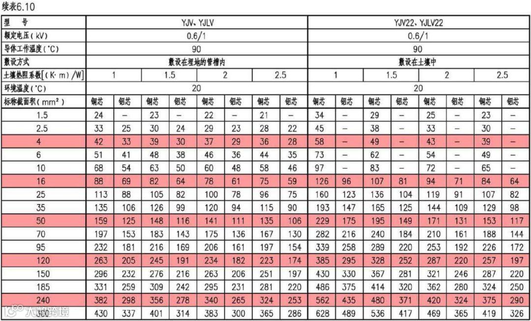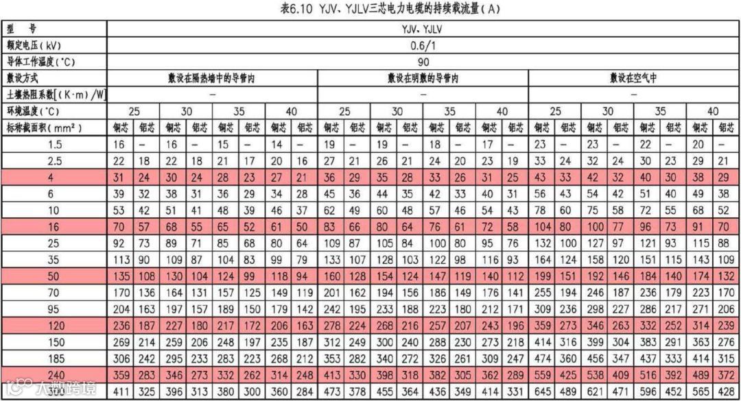 常用的线缆、导体载流量估算可查询如下例表,若需准确计算,还需根据相关敷设条件进行校正。