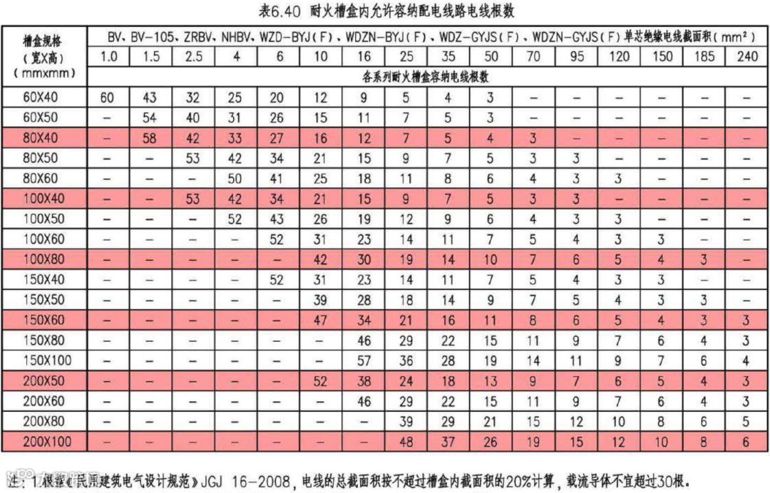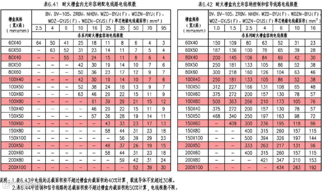 对于槽盒内允许容纳配电线路电线根数,19DX101-1图集中也分别给出了两组数据,一组数据是根据GB50303-2015《建筑电气工程施工质量验收规范》按不超过槽盒内截面积40%编制的,另一组数据是根据行业标准JGJ16-2008《民用建筑电气设计规范》按不超过槽盒内截面积20% 编制的。这两组数据中,也是国家标准较为经济,行业标准相对宽松,使用者同样可根据工程具体情况酌情选用。