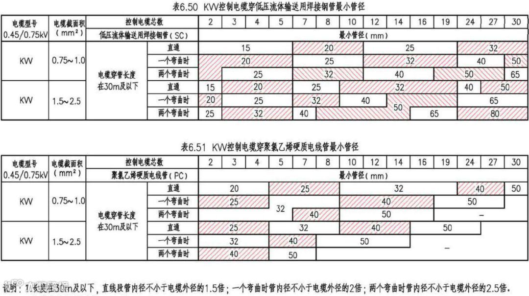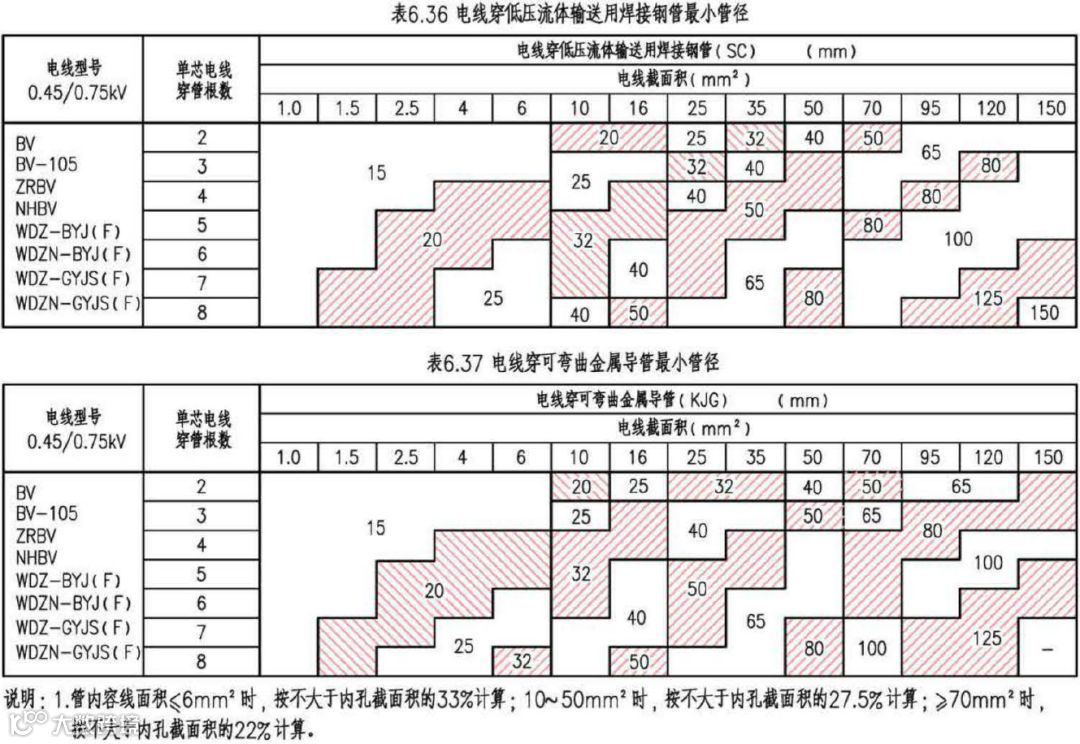 对于电线穿管最小管径,19DX101-1图集中分别给出了两组数据,一组数据是根据GB50054-2011《低压配电设计规范》按不大于内孔截面积40%编制的,另一组数据是根据地方标准按不大于内孔截面积33%、27.5%、22%(容线截面积越大,占比越小)编制的。这两组数据中,国家标准较为经济,地方标准相对宽松,使用者可根据工程具体情况酌情选用。