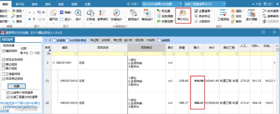 工程编制完成后,通过单价对比功能对相同的清单有不同的单价进行筛选,方便快速调整。