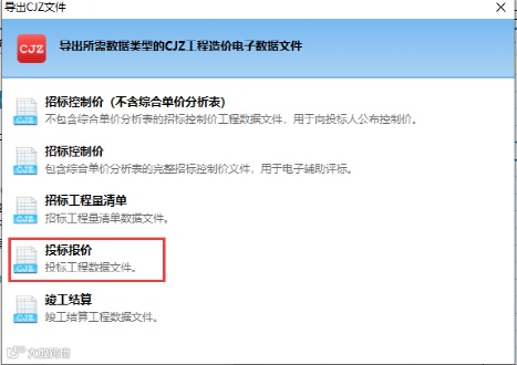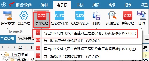 点击电子标—导出CJZ—导出CJZ文件(V2.0)接口,选择投标报价的数据类型。