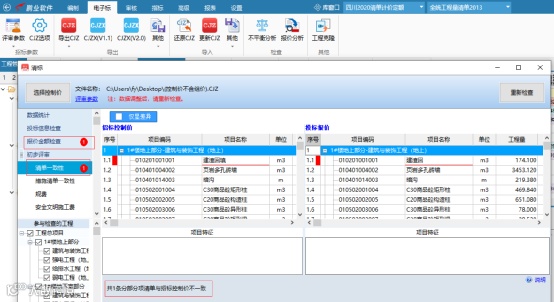 点击电子标-报价分析按钮,选择招标控制价(不含综合单价分析表)CJZ。软件会根据相应的评审参数与招标CJZ文件进行对比。有问题的内容软件会有红色的标注,并且双击投标数据可以定位到具体的工程中查看和修改。