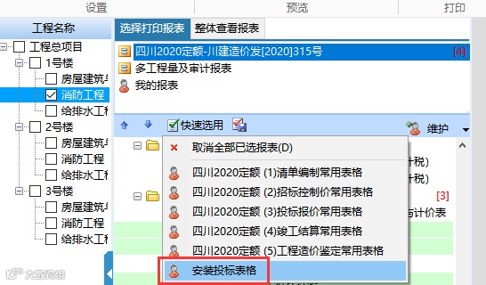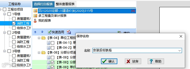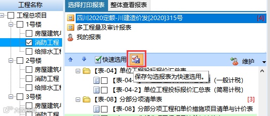 报表里可以自主设置常用的报表组,方便进行快速选用,当然软件也内设了一些招投标的常用表格,可以直接进行选用。